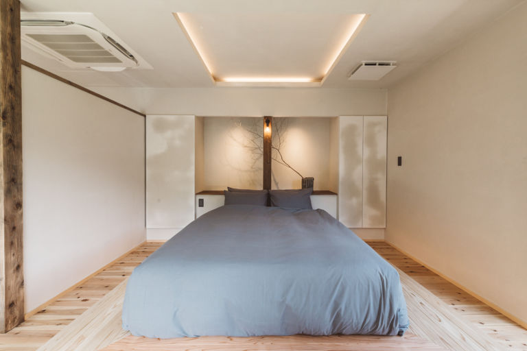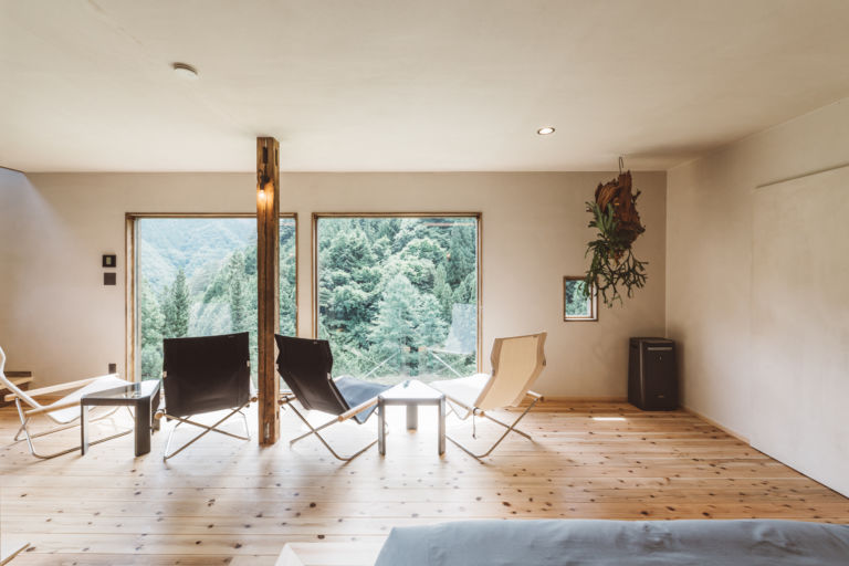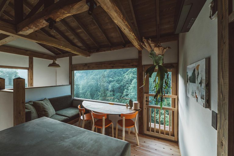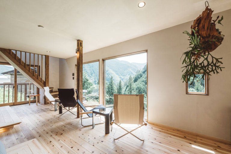 カップルやご家族にぴったりの、落ち着いた空間です。2階は充実のキッチンと窓に面したテーブル、1階はベッドスペースと隠れ家のような小さな書斎スペースを完備。両階とも、大きな窓の向こうに四季折々の小菅村の山を見渡すことができます。