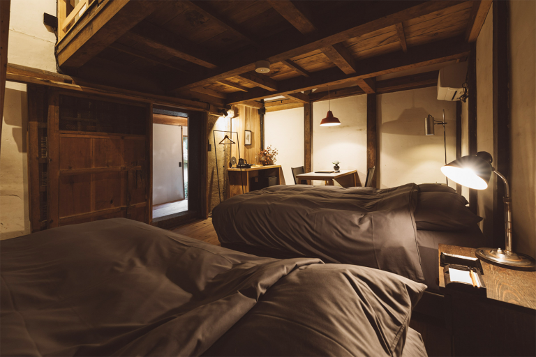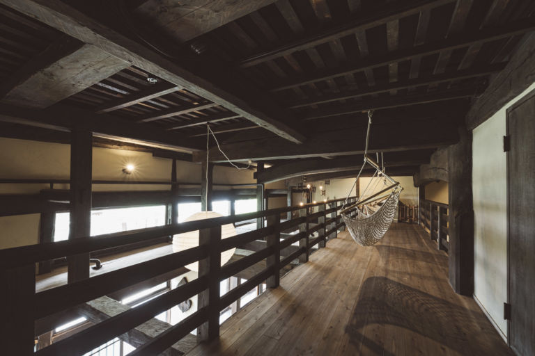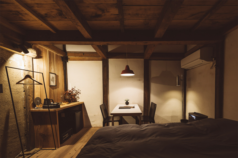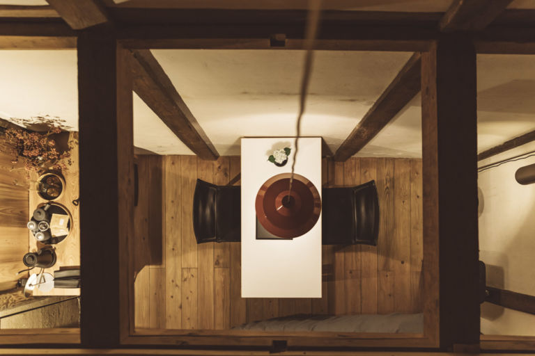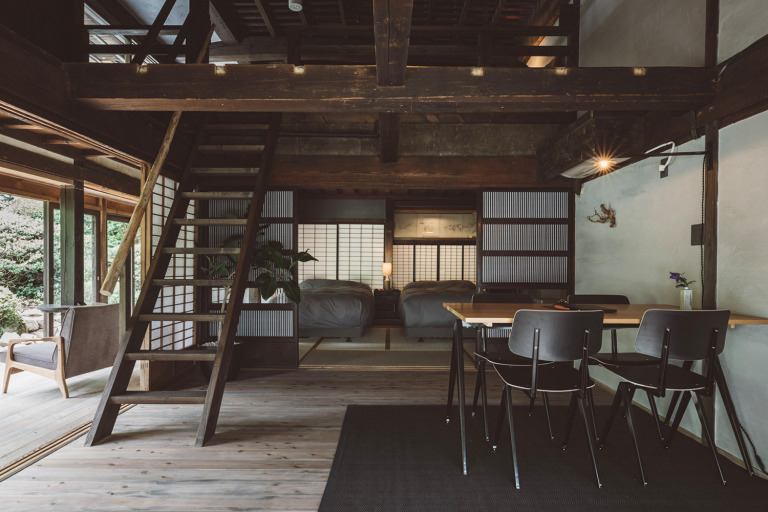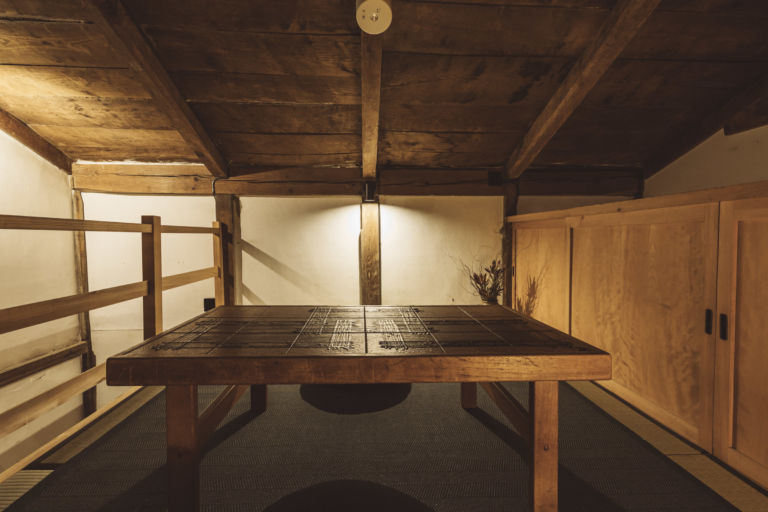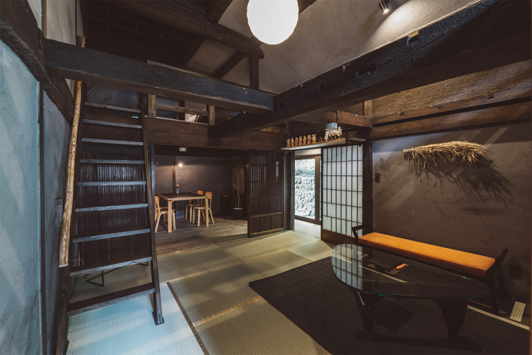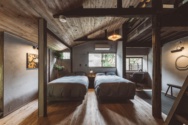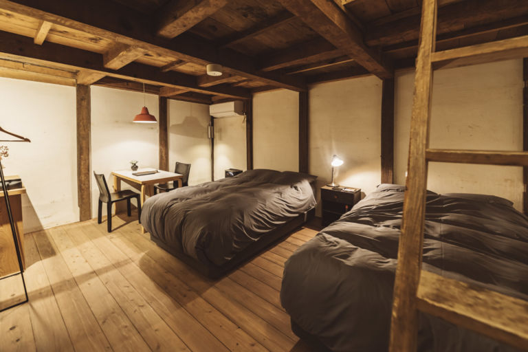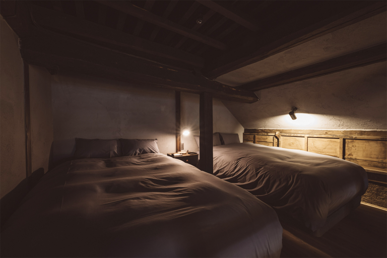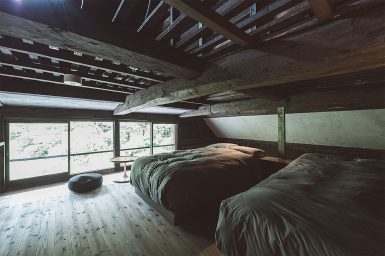 かつては、村に来た要人の泊まる場所でもあったという部屋はスイートルームとしてよみがえりました。広々とした縁側からは、村の自然を切り取ったような庭の風景を一望できます。屋根裏を改装した広いロフトは、重厚な梁が間近で見られる非日常空間です。