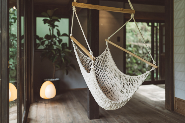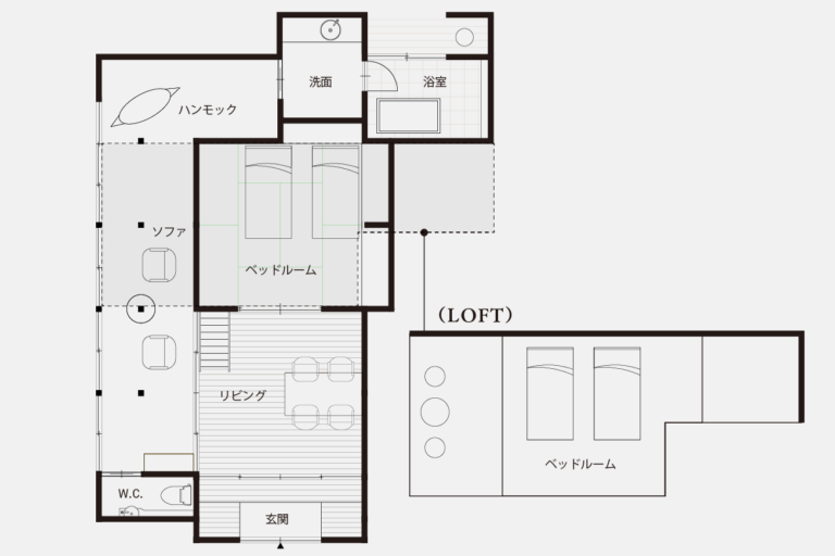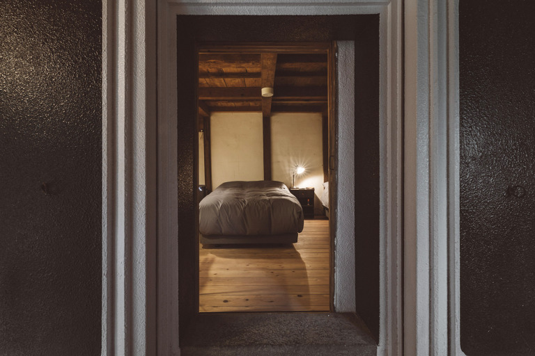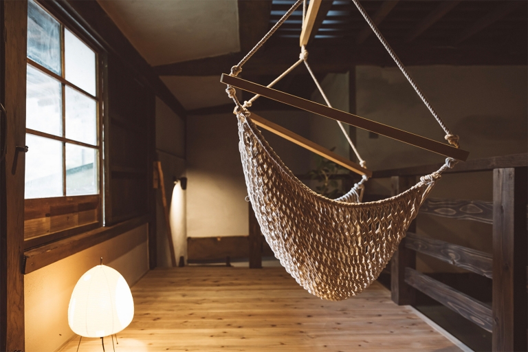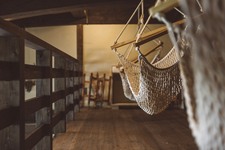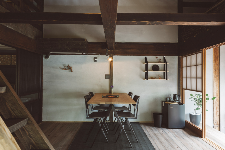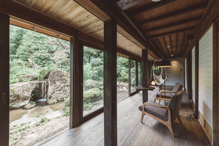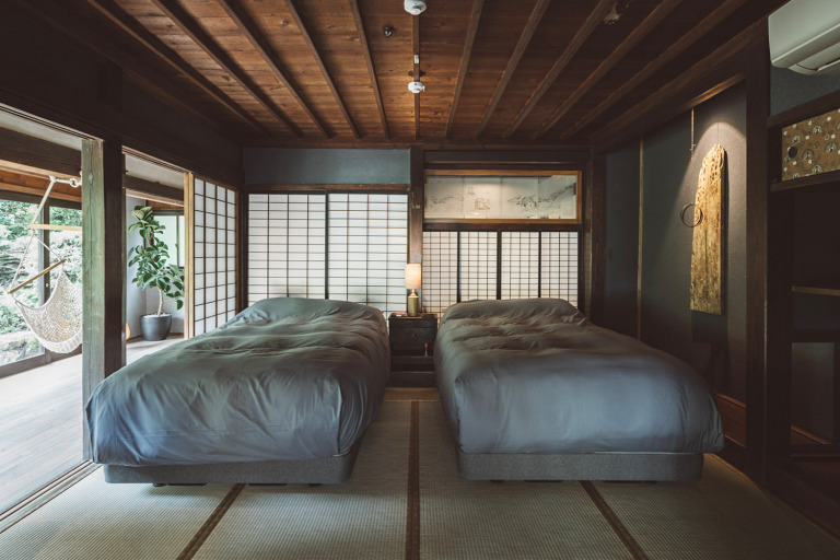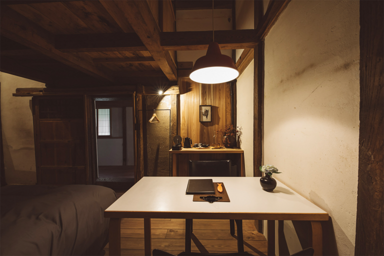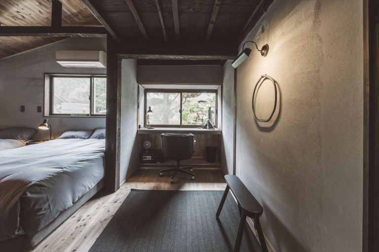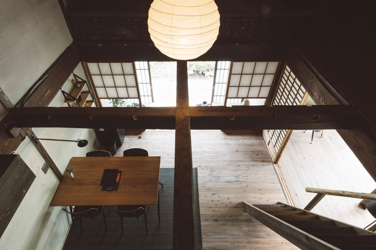 かつては、村に来た要人の泊まる場所でもあったという部屋はスイートルームとしてよみがえりました。広々とした縁側からは、村の自然を切り取ったような庭の風景を一望できます。屋根裏を改装した広いロフトは、重厚な梁が間近で見られる非日常空間です。