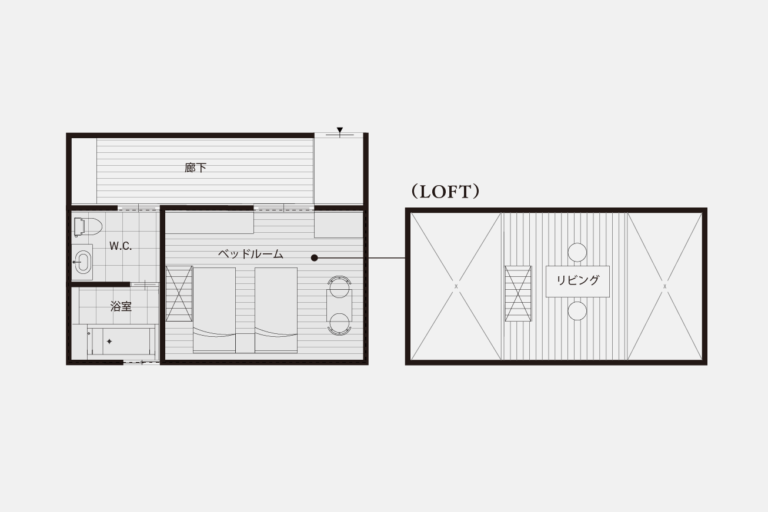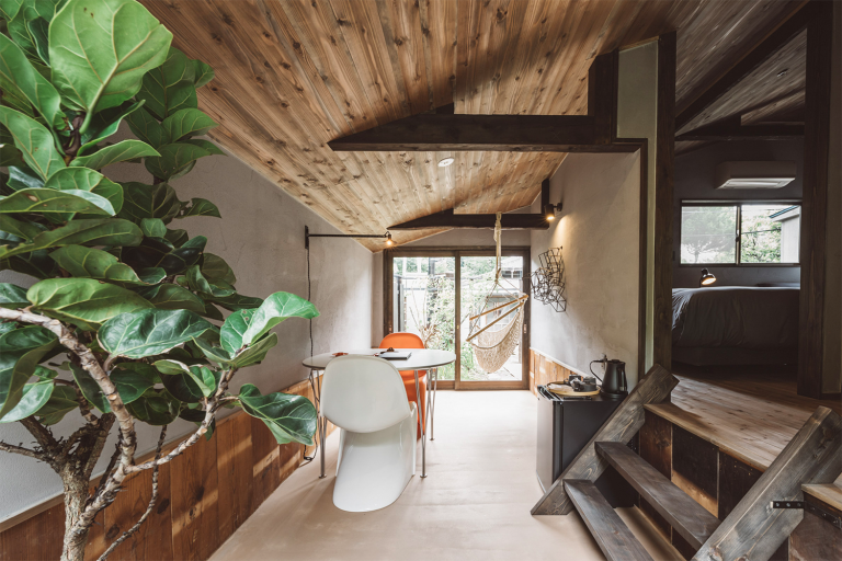 2つのロフトを備えた遊び心のあるお部屋。縁側からは竹林を望むことができます。ご朝食はその竹林を眺めながらお召し上がりいただけます。