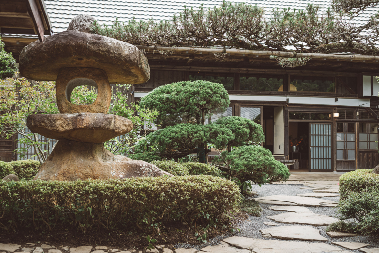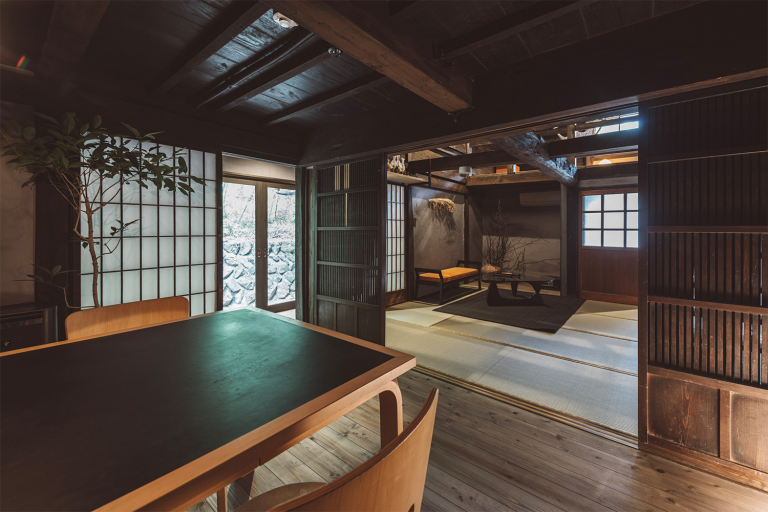 かつて養蚕を営んでいた豪農の邸宅ー「細川邸」。高く太い梁を持つ主屋と、重厚感のある離れの土蔵は客室に、日本の伝統的な長屋門はレストランへ生まれ変わりました。